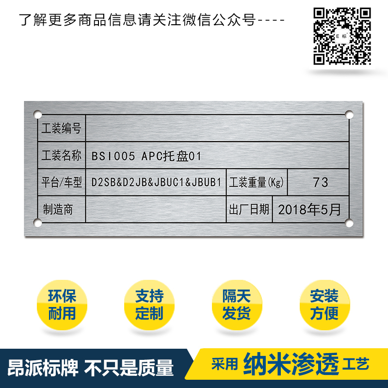 汽車銘牌標(biāo)牌 時間:2018-05-14 09:01:16 分類:金屬銘牌 瀏覽:次 標(biāo)牌、銘牌、鋁牌的品質(zhì): 耐腐蝕性、耐化學(xué)品性、耐高溫、抗刮傷、耐摩擦、使用不易褪色,上海昂派標(biāo)牌公司通過SGS通標(biāo)認(rèn)證以及ISO9001質(zhì)量檢測認(rèn)證,戶內(nèi)戶外都可以使用,能承受一定力的外物對它的搓揉和碰擊。 分享收藏: 上一個: 機(jī)電設(shè)備銘牌標(biāo)牌 下一個: 鋁合金汽車銘牌標(biāo)牌 相關(guān)產(chǎn)品 特種設(shè)備陽極氧化鋁銘牌標(biāo)牌 陽極氧化指示小銘牌標(biāo)牌 自動化設(shè)備鋁銘牌標(biāo)牌 設(shè)備信息陽極氧化銘牌標(biāo)牌 汽車零配件鋁銘牌標(biāo)牌 產(chǎn)線標(biāo)識鋁銘牌標(biāo)牌