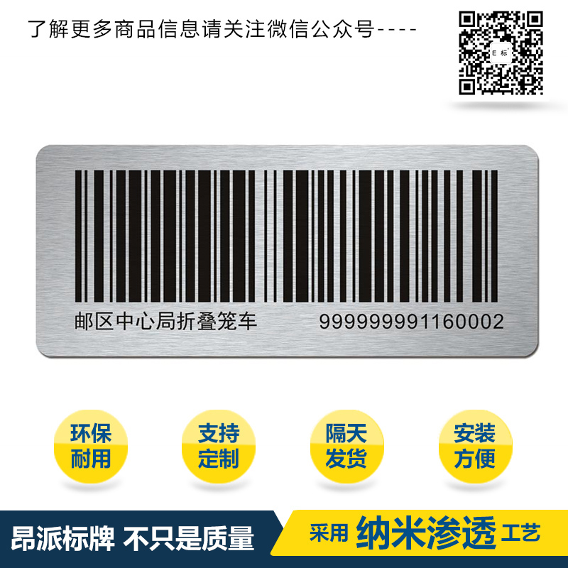 郵局運(yùn)輸條碼銘牌標(biāo)牌 時(shí)間:2018-05-18 18:46:26 分類:金屬條碼 瀏覽:次 金屬二維碼采取高科技印刷工藝以及質(zhì)量優(yōu)勢: 金屬二維碼---進(jìn)口納米鋁板---高科技德國滲透印刷技術(shù)---耐摩擦,耐溶劑,耐高溫,抗摩擦,耐紫外線,耐化學(xué)品性,耐腐蝕性,滲透印刷技術(shù)做出來的金屬二維碼使用壽命久不會掉色,金屬二維碼識別率快,掃描識別率高,并能保持光潔如新。 分享收藏: 上一個(gè): 流水線條碼銘牌標(biāo)牌 下一個(gè): 電網(wǎng)條碼銘牌標(biāo)牌 相關(guān)產(chǎn)品